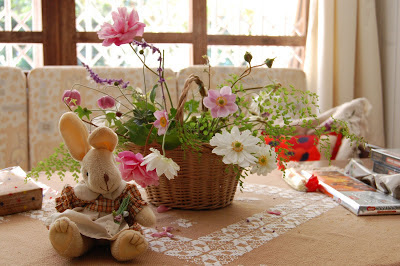 Como todo bom alemão, a casa da sogra está sempre florida em ocasiões especiais, e as flores são colhidas no jardim da casa. Flores na mesa de centro da sala de estar.