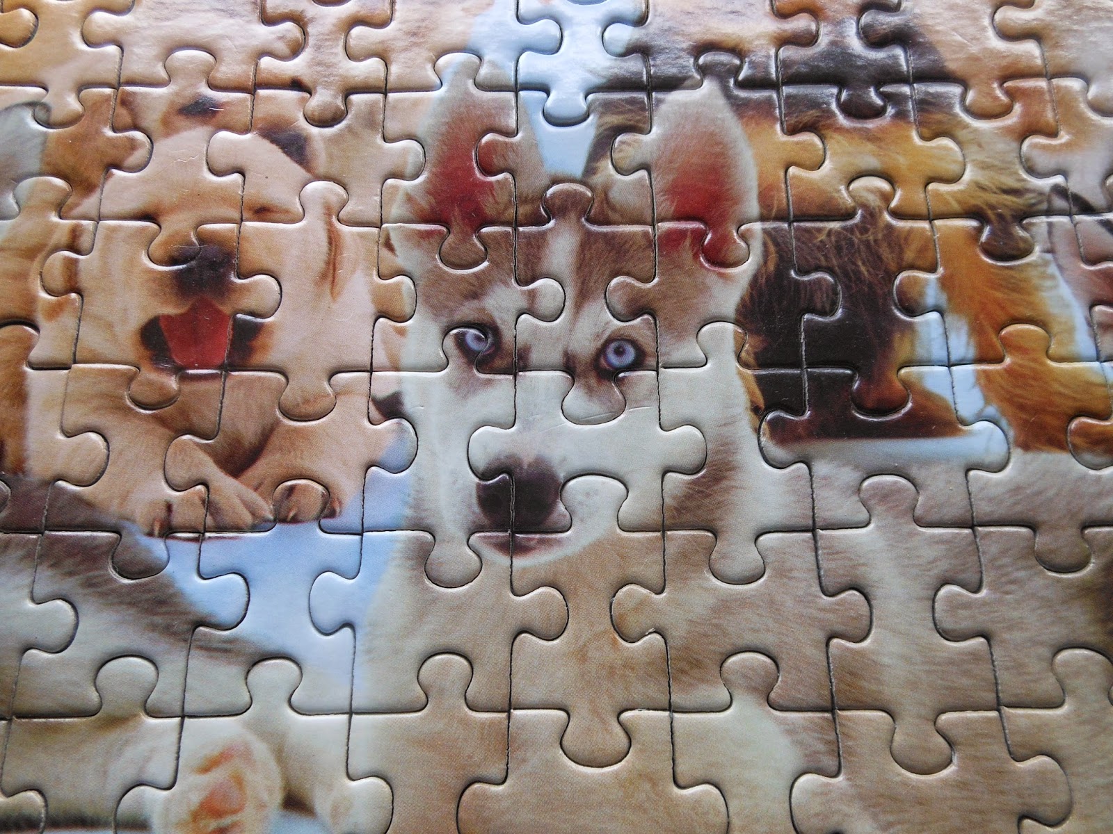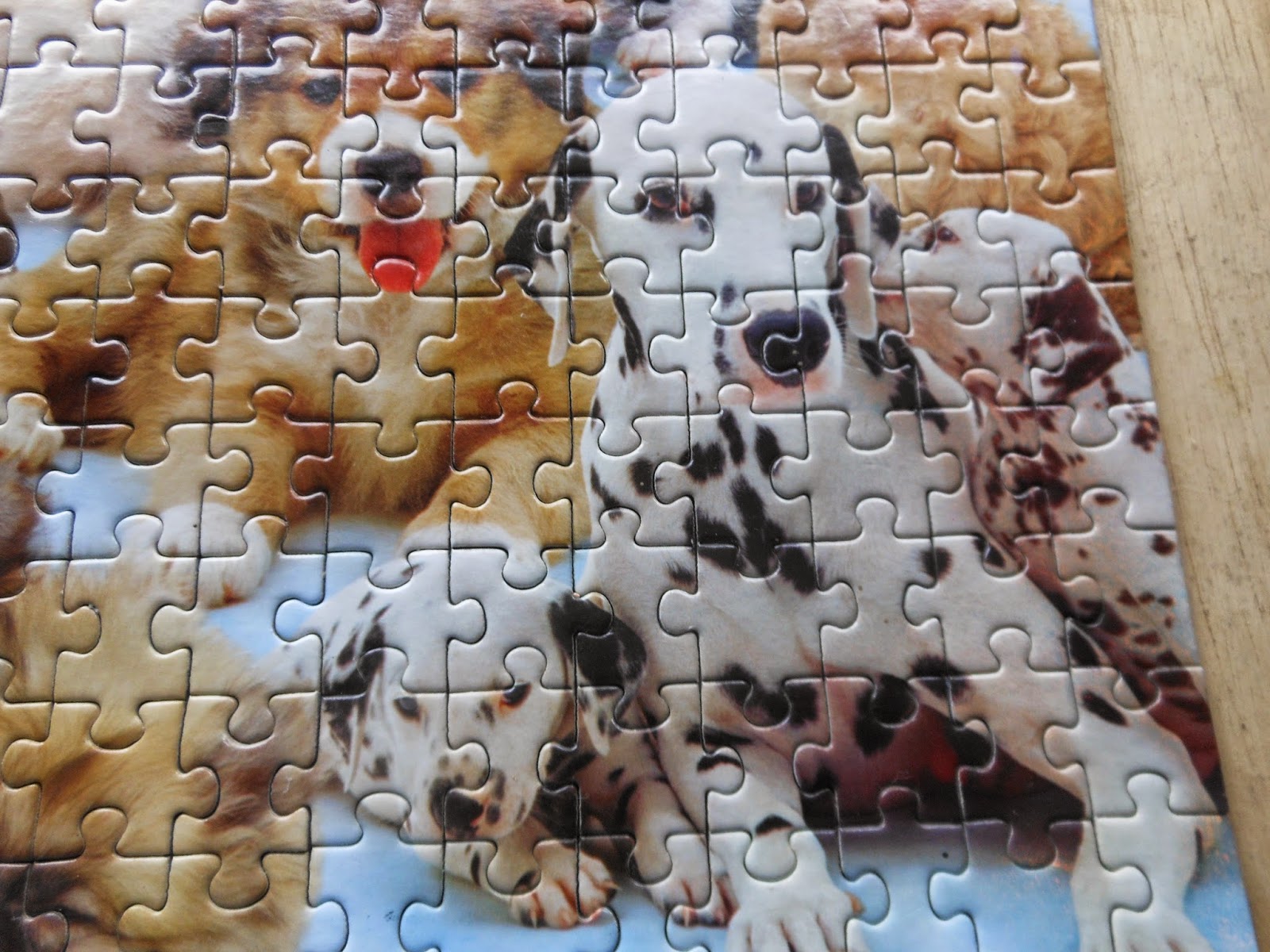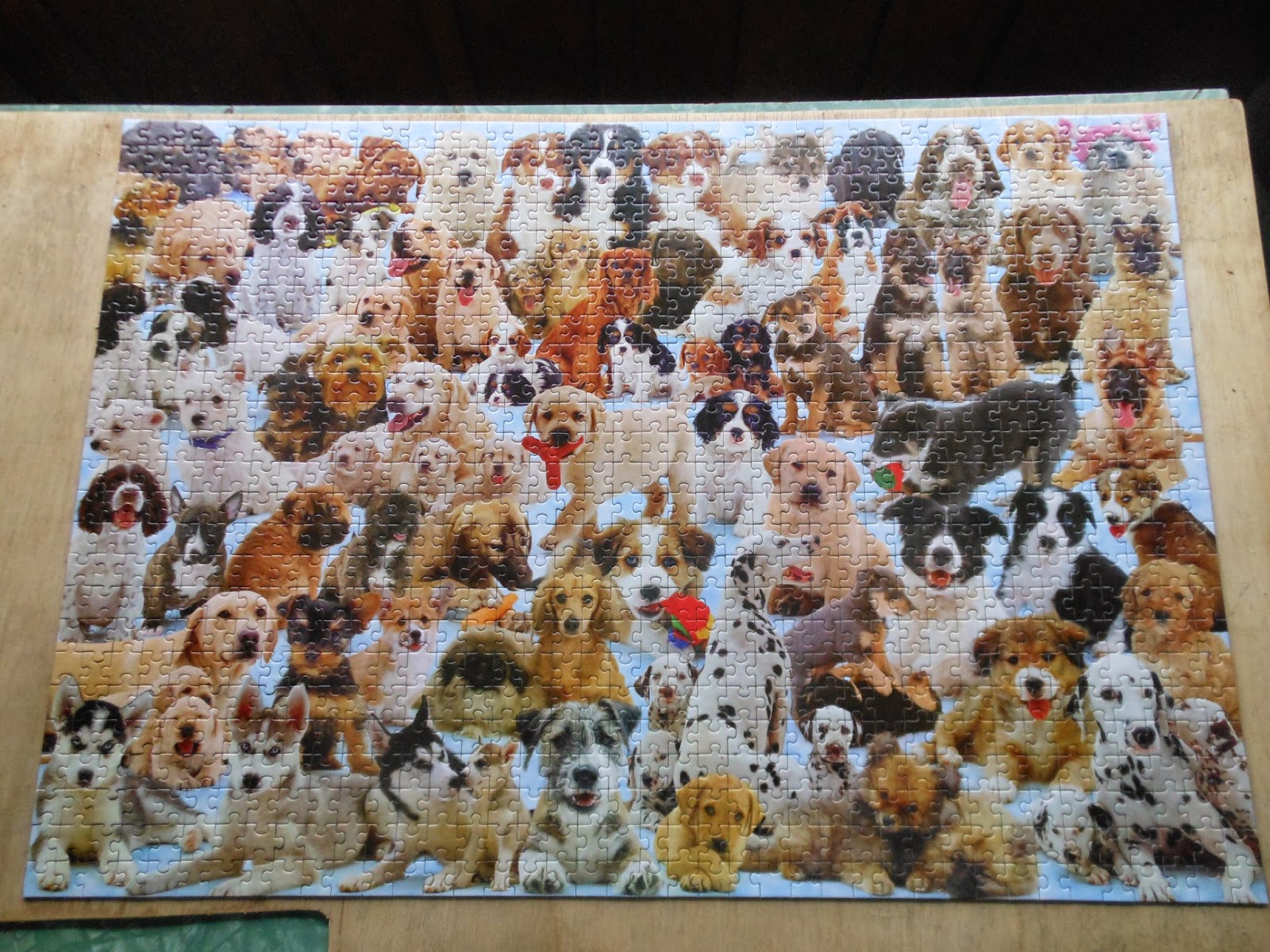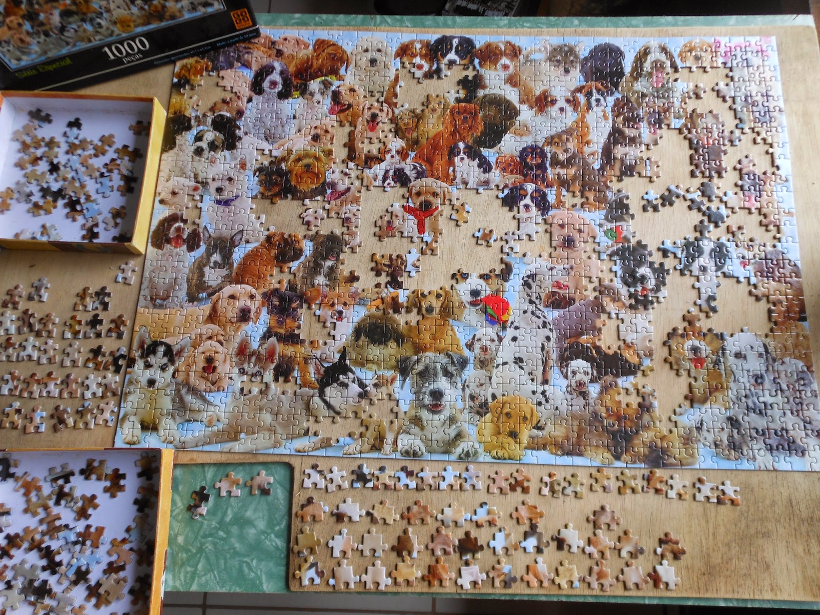 A tardinha chegaram meus sogros e minha cunhada. Minha sogra, que já tinha terminado o quebra-cabeça dela, foi correndo ver o meu e tentar descobrir o erro. Olhou por um tempo, passou a peça por todo o quebra-cabeça para ver a tonalidade, contou quantos cães haviam na ilustração e nada de achar o nariz do husky.
