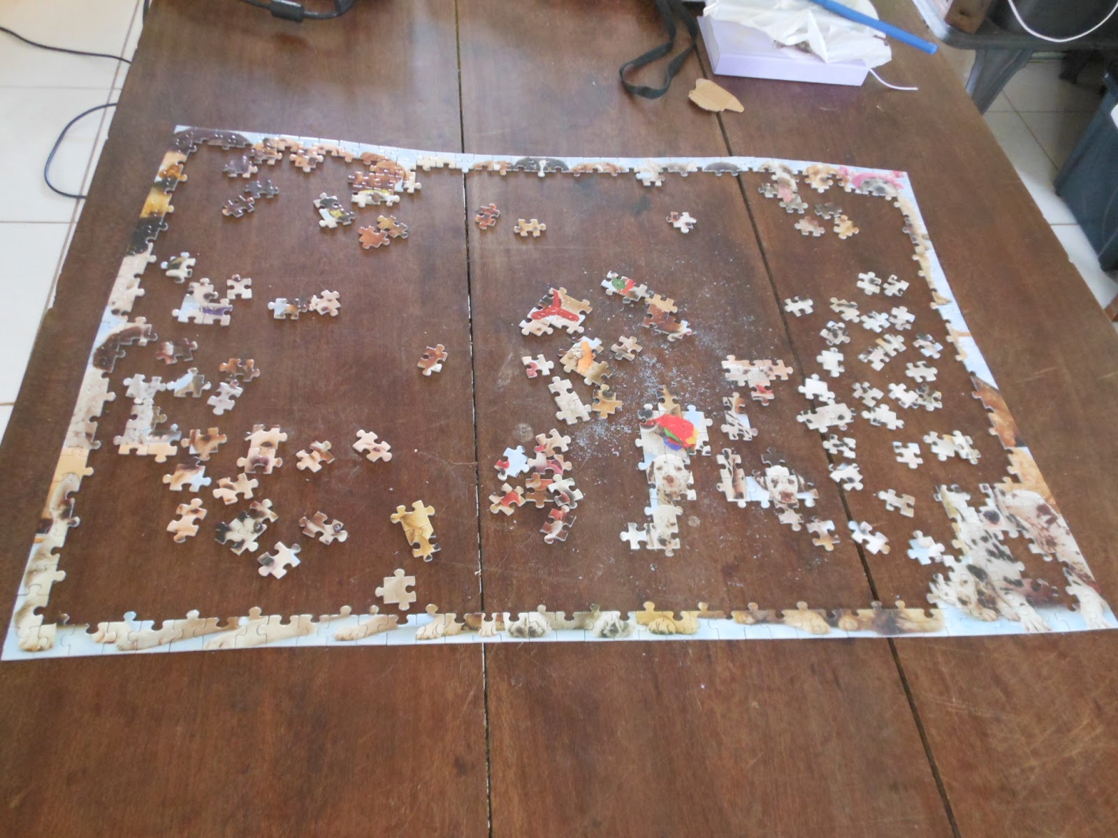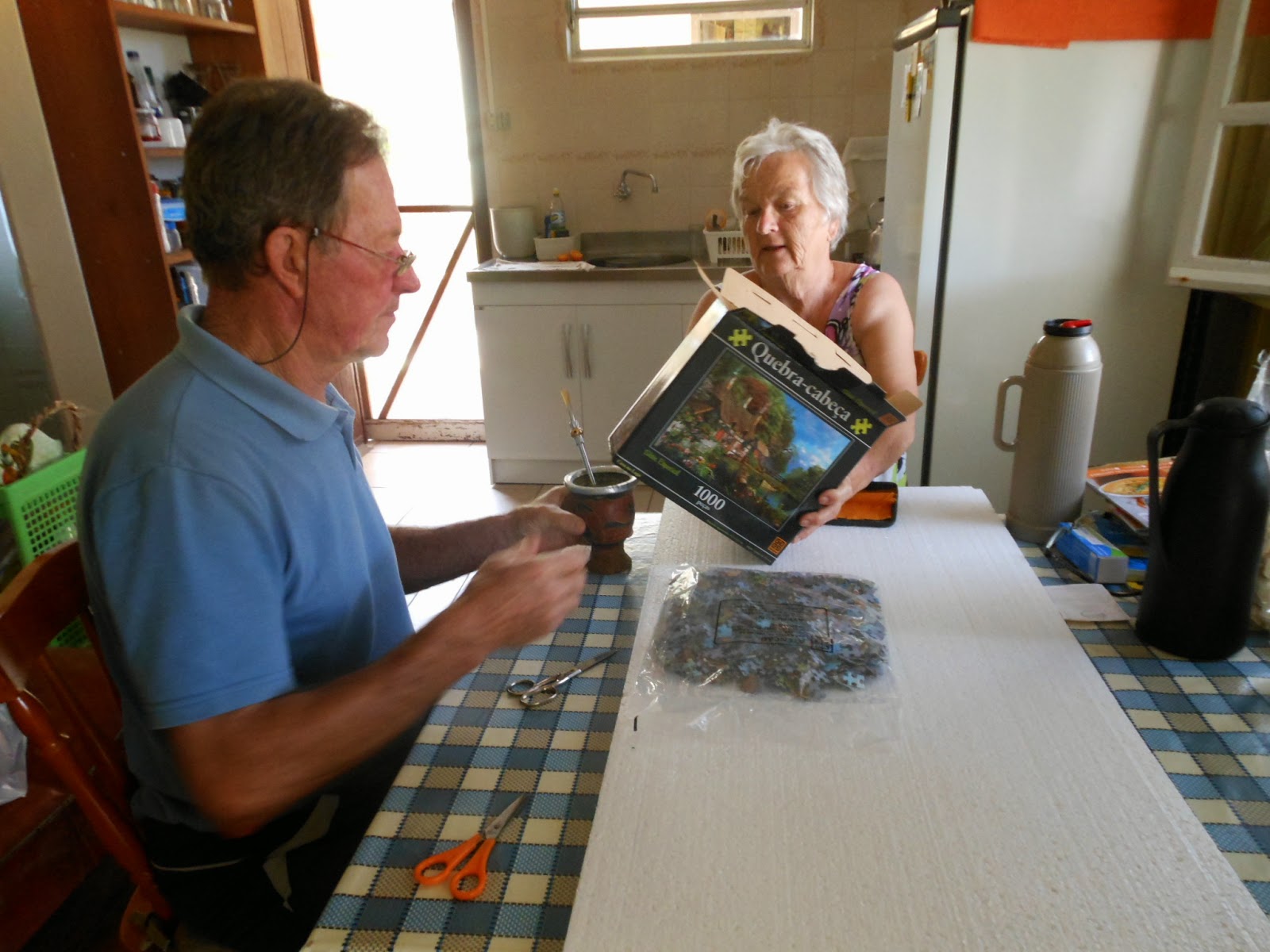 Como já comentei antes, parece que o sogro está com começo de Alzheimer e ele não quer fazer nada que o médico sugeriu. Pelo que falam e desde que conheço, o sogro nunca foi uma pessoa muito agitada mas ele estava sempre fazendo alguma coisa. Seu Egon foi professor de Educação Física (tal pai, tal filho) e adorava a profissão. Quando se aposentou, passou a se dedicar mais ao jardim das casas de Nova Petrópolis e na praia, sempre teve habilidade para trabalhar com madeira (tal pai, tal filho) e amava andar de bicicleta (tal pai, tal filho). Com os acontecimentos que nos levaram a desconfiar da doença e levá-lo ao médico, veio a proibição de pedalar sozinho como sempre fez, pedalando mais de cem quilômetros em um dia. Acho que era o que mais lhe dava prazer. No aniversário de 70 anos, decidiu que passaria o dia pedalando e foi o que fez. Agora cheio de restrições, tem se mostrado entediado, com toda a razão e se não tem o que fazer no jardim, fica sem saber o que fazer. Tentando descobrir algo quer lhe dê prazer, Leonardo comprou um quebra-cabeça de 1000 peças para ver se o pai se empolgava.
