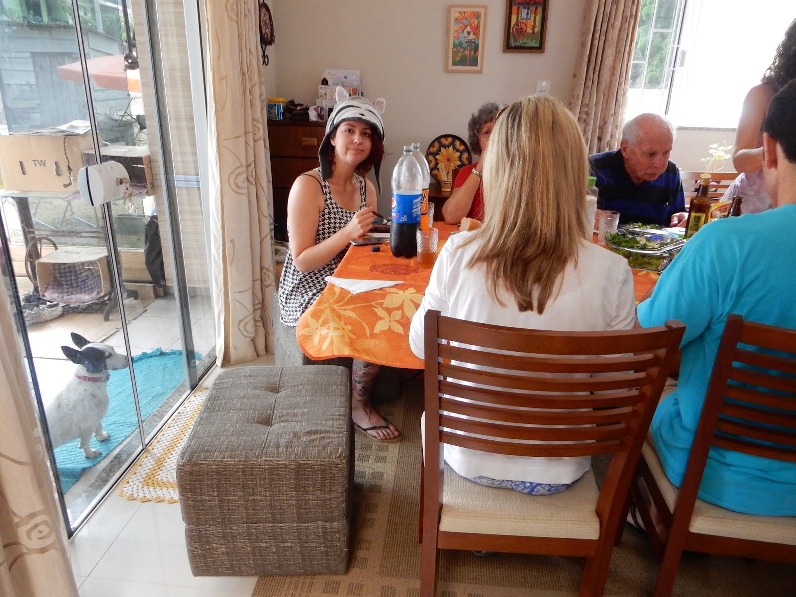 Ela saiu da cama direto para a mesa, pois o almoço estava pronto e eu não gostei desta parte, pois fiquei do lado de fora, no calorão, só olhando eles todos comendo.