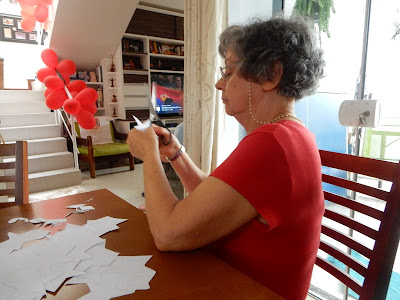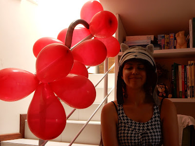 Os meus primos Marco e Marina estavam dormindo e a vovó e o vovô ficaram enchendo balões para enfeitar a casa. Volta e meia estourava um balão e eu levava um susto daqueles! Detesto barulho de foguetes, bombas, bombinhas, fogos de artíficios ou que lembre eles.
